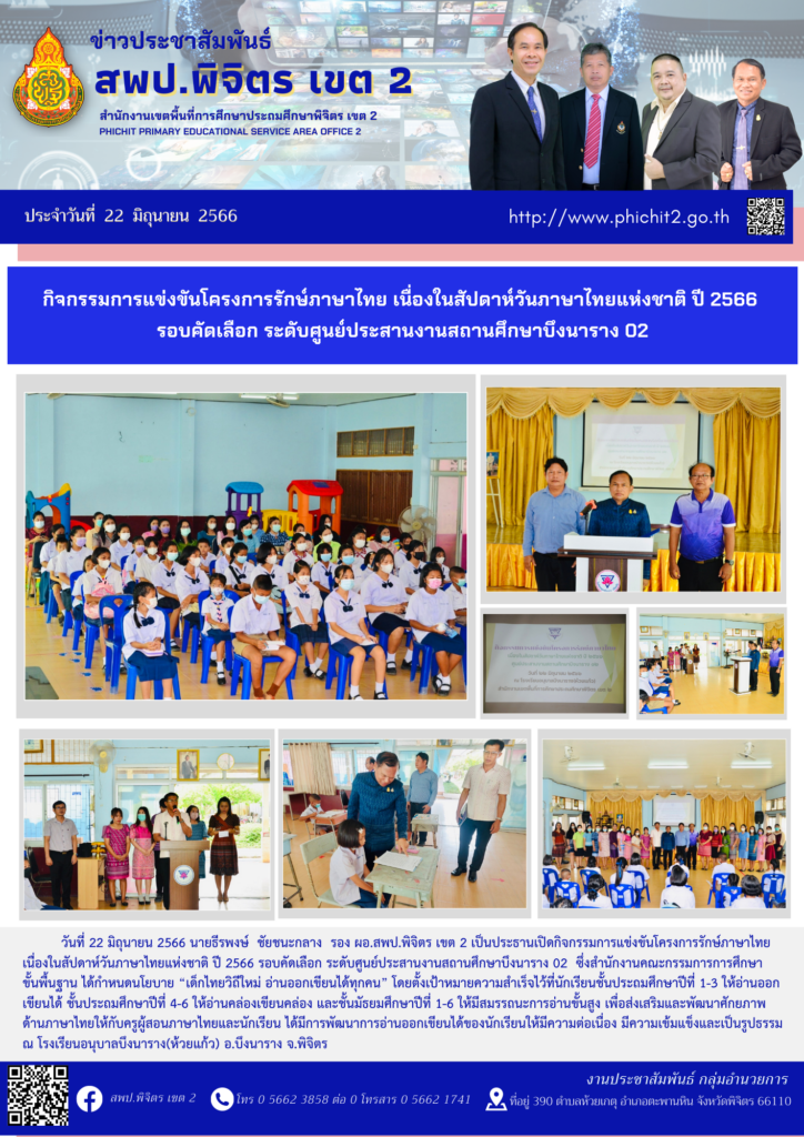 กิจกรรมการแข่งขันโครงการรักษ์ภาษาไทย เนื่องในสัปดาห์วันภาษาไทยแห่งชาติ ปี 2566 รอบคัดเลือก ระดับศูนย์ประสานงานสถานศึกษาบึงนาราง 02