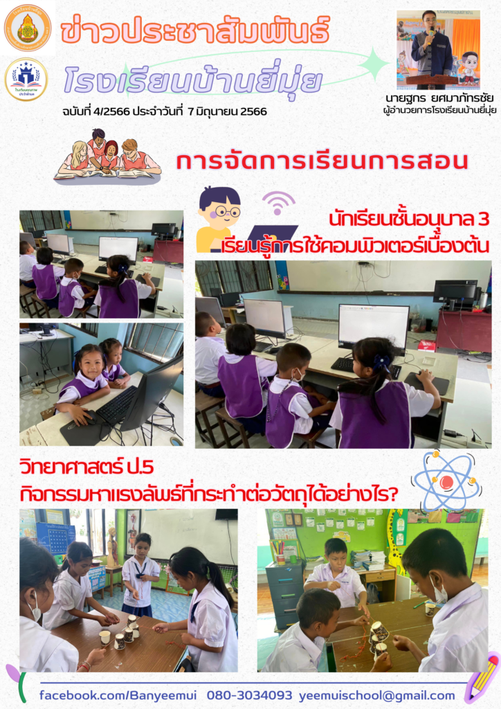 การจัดการเรียนการสอน ชั้นอนุบาล 3 เรียนรู้การใช้คอมพิวเตอร์เบื้องต้น และวิชาวิทยาศาสตร์ ระดับชั้นประถมศึกษาปีที่ 5 กิจกรรมหาแรงลัพท์ที่กระทำต่อวัตถุได้อย่างไร