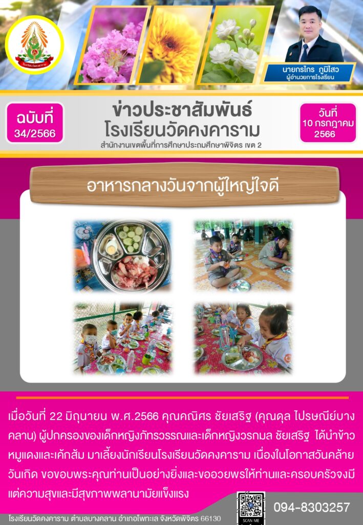 ชัยเสริฐ (คุณดุล ไปรษณีย์บางคลาน)ได้นำข้าวหมูแดงและเค้กส้ม มาเลี้ยงนักเรียนโรงเรียนวัดคงคาราม เนื่องในโอกาสวันคล้ายวันเกิด