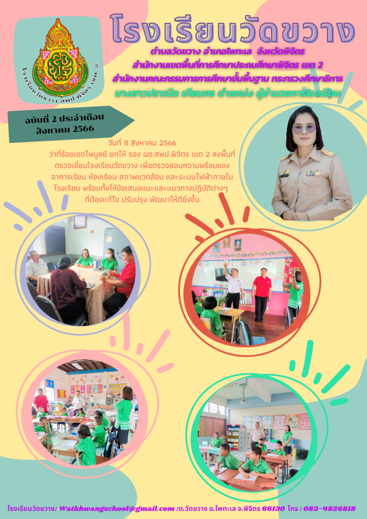 ว่าที่ร้อยเอกไพบูลย์ ยกให้ รอง ผอ.สพป.พิจิตร เขต 2 ลงพื้นที่ตรวจเยี่ยมโรงเรียนวัดขวาง เพื่อตรวจสอบความพร้อมของอาคารเรียน ห้องเรียน สภาพแวดล้อม และระบบไฟฟ้าภายในโรงเรียน พร้อมทั้งให้ข้อเสนอแนะและแนวทางปฏิบัติต่างๆ ที่ต้องแก้ไข ปรับปรุง พัฒนาให้ดียิ่งขึ้น