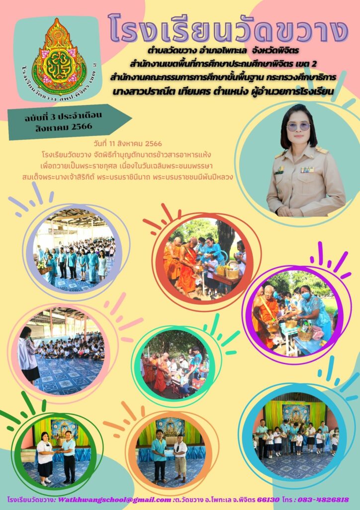 โรงเรียนวัดขวาง จัดพิธีทำบุญตักบาตรข้าวสารอาหารแห้ง เพื่อถวายเป็นพระราชกุศล เนื่องในวันเฉลิมพระชนมพรรษา สมเด็จพระนางเจ้าสิริกิต์ พระบรมราชินีนาถ พระบรมราชชนนีพันปีหลวง
