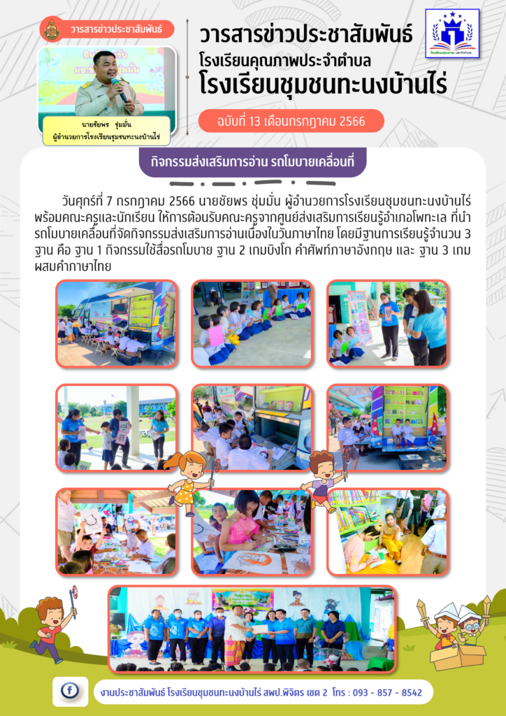 วันศุกร์ที่ 7 กรกฎาคม 2566 นายชัยพร ชุ่มมั่น ผู้อำนวยการโรงเรียนชุมชนทะนงบ้านไร่ พร้อมคณะครูและนักเรียน ให้การต้อนรับคณะครูจากศูนย์ส่งเสริมการเรียนรู้อำเภอโพทะเล ที่นำรถโมบายเคลื่อนที่จัดกิจกรรมส่งเสริมการอ่านเนื่องในวันภาษาไทย โดยมีฐานการเรียนรู้จำนวน 3 ฐาน คือ ฐาน 1 กิจกรรมใช้สื่อรถโมบาย ฐาน 2 เกมบิงโก คำศัพท์ภาษาอังกฤษ และ ฐาน 3 เกมผสมคำภาษาไทย