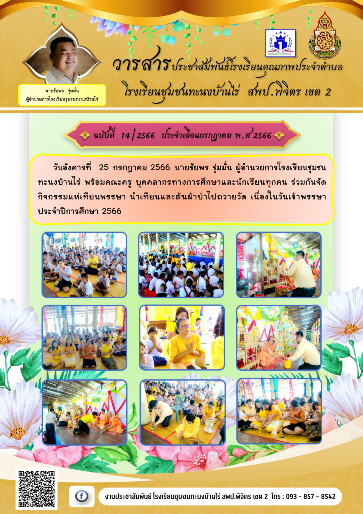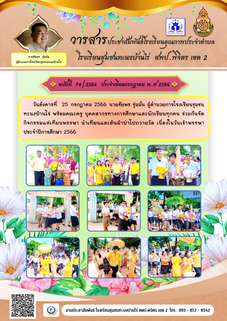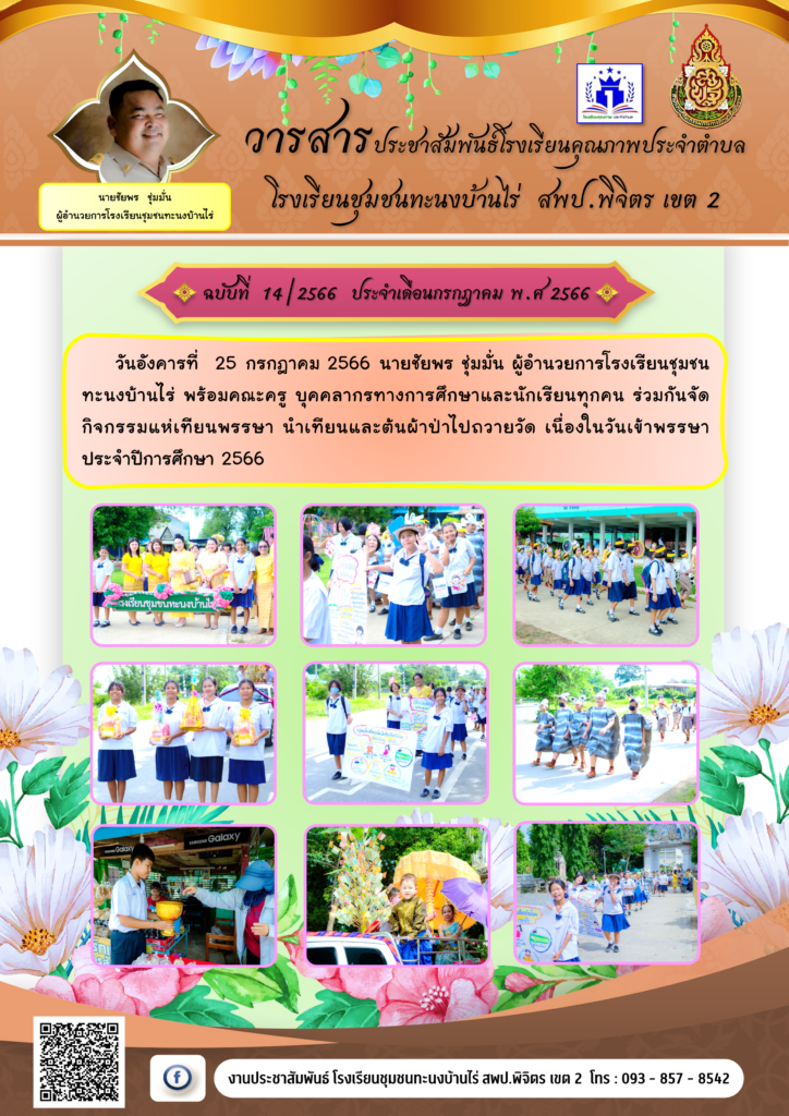 วันอังคารที่ 25 กรกฎาคม 2566 นายชัยพร ชุ่มมั่น ผู้อำนวยการโรงเรียนชุมชนทะนงบ้านไร่ พร้อมคณะครู บุคคลากรทางการศึกษาและนักเรียนทุกคน ร่วมกันจัดกิจกรรมแห่เทียนพรรษา นำเทียนและต้นผ้าป่าไปถวายวัด เนื่องในวันเข้าพรรษา ประจำปีการศึกษา 2566