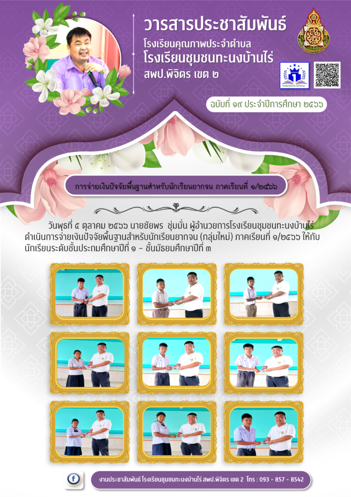 วันพุธที่ ๕ ตุลาคม ๒๕๖๖ นายชัยพร ชุ่มมั่น ผู้อำนวยการโรงเรียนชุมชนทะนงบ้านไร่ ดำเนินการจ่ายเงินปัจจัยพื้นฐานสำหรับนักเรียนยากจน (กลุ่มใหม่) ภาคเรียนที่ ๑/๒๕๖๖ ให้กับนักเรียนระดับชั้นประถมศึกษาปีที่ ๑ – ชั้นมัธยมศึกษาปีที่ ๓