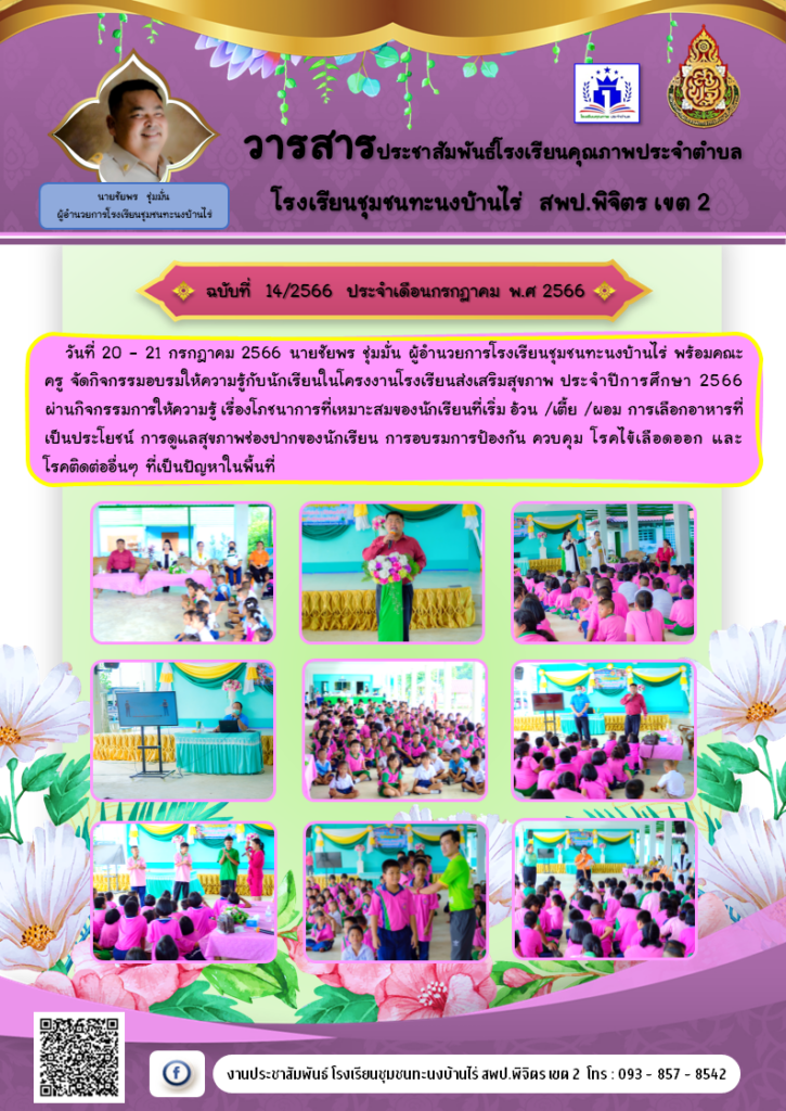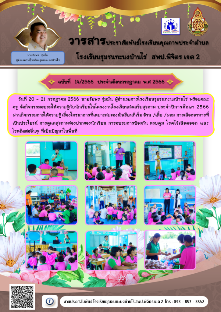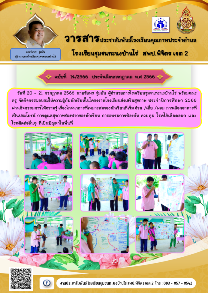 วันที่ 20 – 21 กรกฎาคม 2566 นายชัยพร ชุ่มมั่น ผู้อำนวยการโรงเรียนชุมชนทะนงบ้านไร่ พร้อมคณะครู จัดกิจกรรมอบรมให้ความรู้กับนักเรียนในโครงงานโรงเรียนส่งเสริมสุขภาพ ประจำปีการศึกษา 2566 ผ่านกิจกรรมการให้ความรู้ เรื่องโภชนาการที่เหมาะสมของนักเรียนที่เริ่ม อ้วน /เตี้ย /ผอม การเลือกอาหารที่เป็นประโยชน์ การดูแลสุขภาพช่องปากของนักเรียน การอบรมการป้องกัน ควบคุม โรคไข้เลือดออก และโรคติดต่ออื่นๆ ที่เป็นปัญหาในพื้นที่