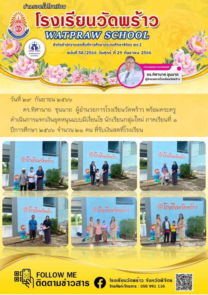 การแจกเงินอุดหนุนแบบมีเงื่อนไข นักเรียนกลุ่มใหม่ ภาคเรียนที่ 1 ปีการศึกษา 2566 โรงเรียนวัดพร้าว