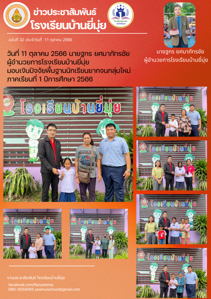 วันที่ 11 ตุลาคม 2566 นายฐกร ยศมาภัทรชัย ผู้อำนวยการโรงเรียนบ้านยี่มุ่ย มอบเงินปัจจัยพื้นฐานนักเรียนยากจนกลุ่มใหม่