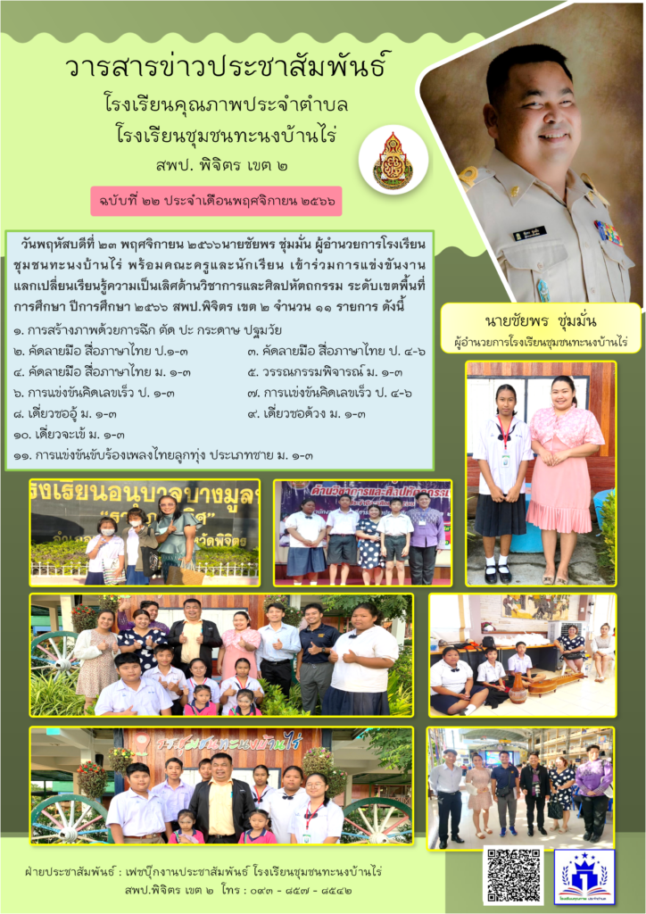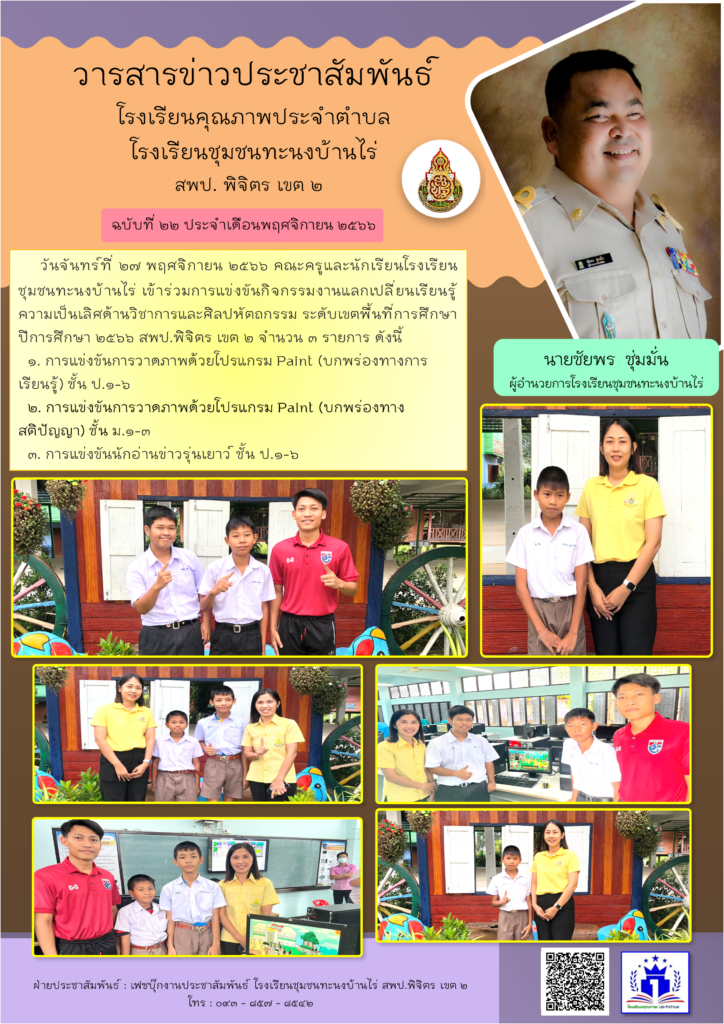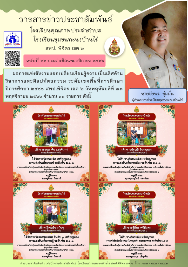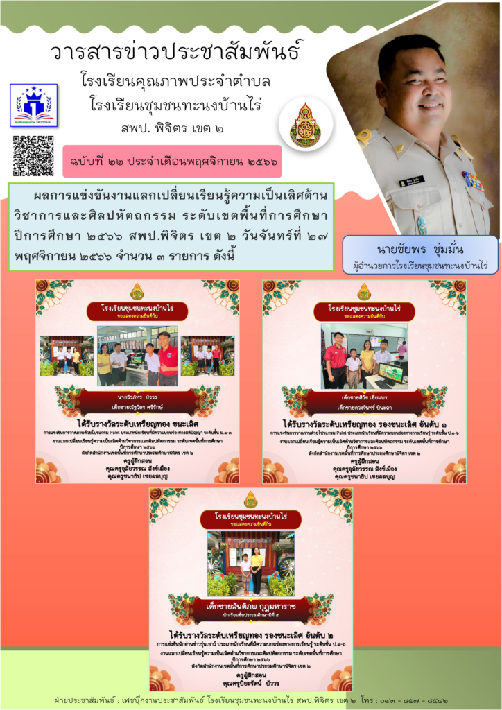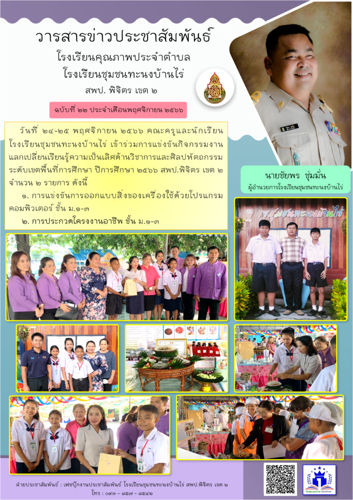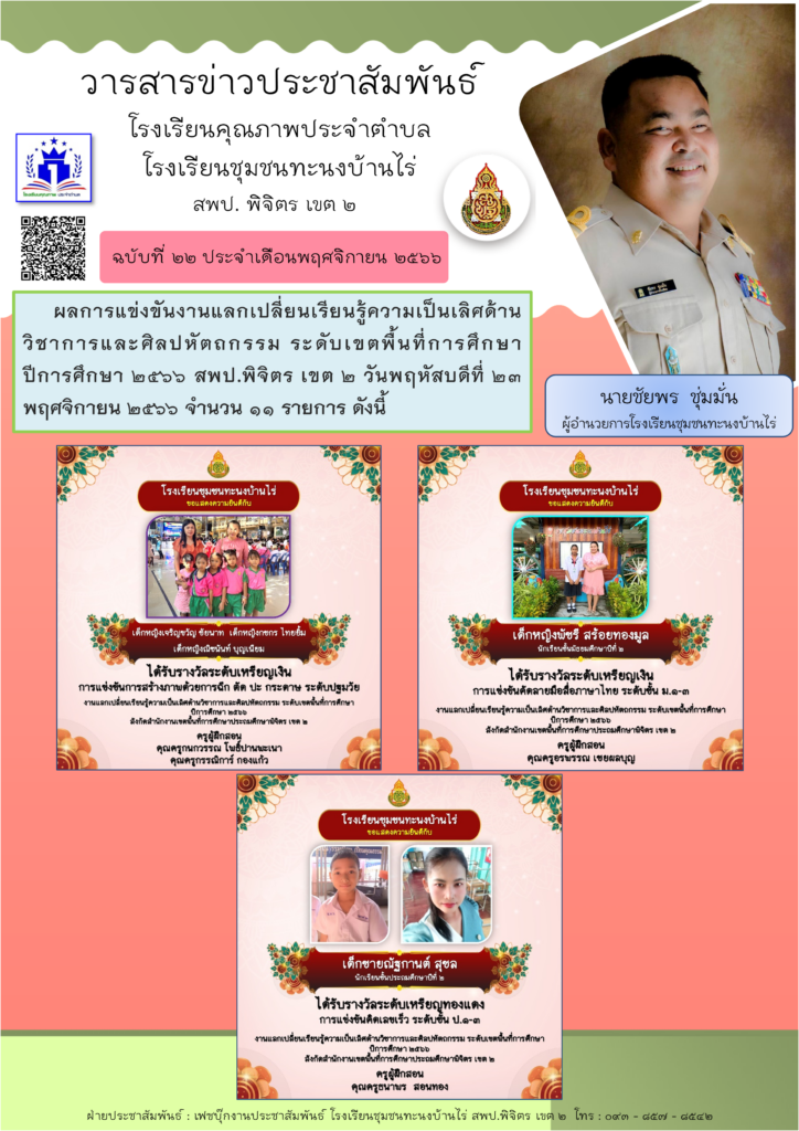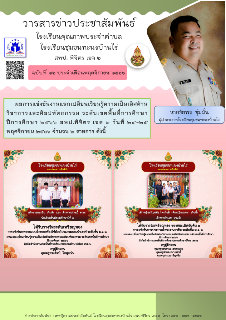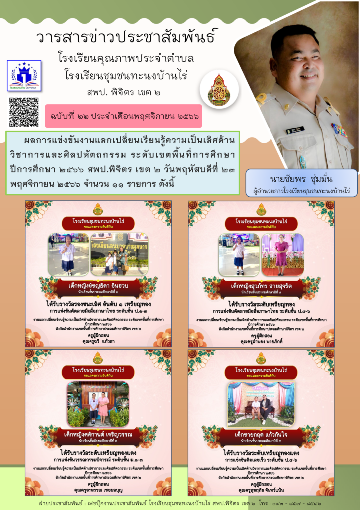 วันที่ ๒๓-๒๗ พฤศจิกายน ๒๕๖๖ คณะครูและนักเรียนโรงเรียนชุมชนทะนงบ้านไร่ เข้าร่วมการแข่งขันกิจกรรมงานแลกเปลี่ยนเรียนรู้ความเป็นเลิศด้านวิชาการและศิลปหัตถกรรม ระดับเขตพื้นที่การศึกษา ปีการศึกษา ๒๕๖๖ สพป.พิจิตร เขต ๒ จำนวน ๑๖ รายการ