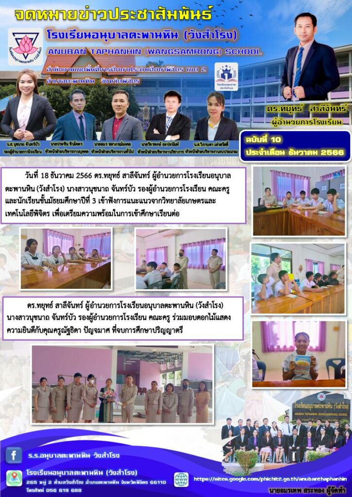 วันที่ 18 ธันวาคม 2566 ดร.ทยุทธ์ สาลีจันทร์ ผู้อำนวยการโรงเรียนอนุบาลตะพานหิน (วังสำโรง) นางสาวนุชนาถ จันทร์บัว รองผู้อำนวยการโรงเรียน คณะครู และนักเรียนชั้นมัธยมศึกษาปีที่ 3 เข้าฟังการแนะแนวจากวิทยาลัยเกษตรและเทคโนโลยีพิจิตร เพื่อเตรียมความพร้อมในการเข้าศึกษาเรียนต่อและร่วมมอบดอกไม้แสดงความยินดีกับคุณครูณัฐธิดา ปัญจมาศ ที่จบการศึกษาปริญญาตรี
