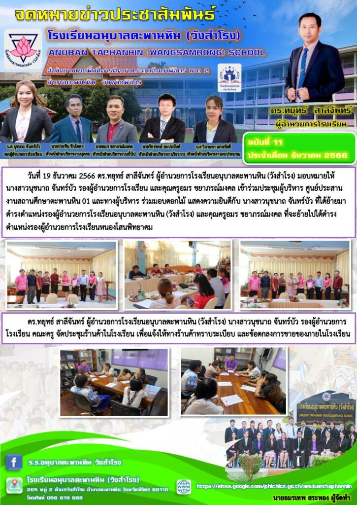 วันที่ 19 ธันวาคม 2566 ดร.ทยุทธ์ สาลีจันทร์ ผู้อำนวยการโรงเรียนอนุบาลตะพานหิน (วังสำโรง) มอบหมายให้ นางสาวนุชนาถ จันทร์บัว รองผู้อำนวยการโรงเรียน และคุณครูอมร ชยาภรณ์มงคล เข้าร่วมประชุมผู้บริหาร ศูนย์ประสานงานสถานศึกษาตะพานหิน 01 และทางผู้บริหาร ร่วมมอบดอกไม้ แสดงความยินดีกับ นางสาวนุชนาถ จันทร์บัว ที่ได้ย้ายมาดำรงตำแหน่งรองผู้อำนวยการโรงเรียนอนุบาลตะพานหิน (วังสำโรง) และคุณครูอมร ชยาภรณ์มงคล ที่จะย้ายไปได้ดำรงตำแหน่งรองผู้อำนวยการโรงเรียนหนองโสนพิทยาคม และจัดประชุมร้านค้าในโรงเรียน เพื่อแจ้งให้ทางร้านค้าทราบระเบียบ และข้อตกลงการขายของภายในโรงเรียน