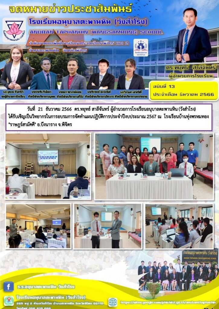 วันที่ 21 ธันวาคม 2566 ดร.ทยุทธ์ สาลีจันทร์ ผู้อำนวยการโรงเรียนอนุบาลตะพานหิน (วังสำโรง) ได้รับเชิญเป็นวิทยากรในการอบรมการจัดทำแผนปฏิบัติการประจำปีงบประมาณ 2567 ณ โรงเรียนบ้านทุ่งพรหมทอง “ราษฎร์สามัคคี” อ.บึงนาราง จ.พิจิตร