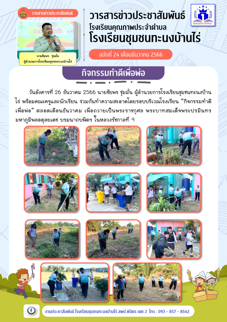 วันอังคารที่ 26 ธันวาคม 2566 นายชัยพร ชุ่มมั่น ผู้อำนวยการโรงเรียนชุมชนทะนงบ้านไร่ พร้อมคณะครูและนักเรียน ร่วมกันทำความสะอาดโดยรอบบริเวณโรงเรียน “กิจกรรมทำดี เพื่อพ่อ” ตลอดเดือนธันวาคม เพื่อถวายเป็นพระราชกุศล พระบาทสมเด็จพระปรมินทรมหาภูมิพลอดุลยเดช บรมนาถบพิตร ในหลวงรัชกาลที่ 9