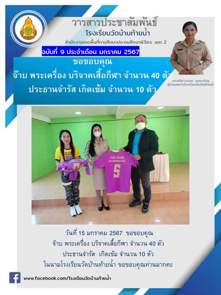 15 ม.ค.67 จ๊าบ พระเครื่องท้ายน้ำ มอบเสื้อกีฬาจำนวน 40 ตัว เเละนายจำรัส เกิดเข้ม ปะธานสภา อบต.ท้ายน้ำมอบเสื้อกีฬา 10 ตัว เพื่อใช้ในการเเข่งขันกีฬาระดับศูนย์ประสานงานสถานศึกษาโพทะเล 01 ในวันที่ 25-26 มกราคม 2567