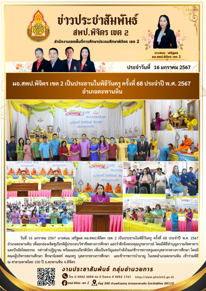 ผอ.สพป.พิจิตร เขต 2 เป็นประธานในพิธีวันครู ครั้งที่ 68 ประจำปี พ.ศ. 2567 อำเภอตะพานหิน