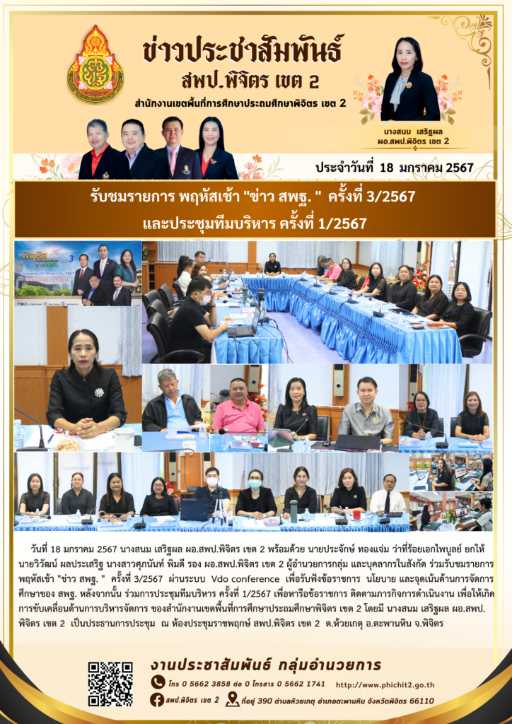 รับชมรายการ พฤหัสเช้า “ข่าว สพฐ. ” ครั้งที่ 3/2567 และประชุมทีมบริหาร ครั้งที่ 1/2567