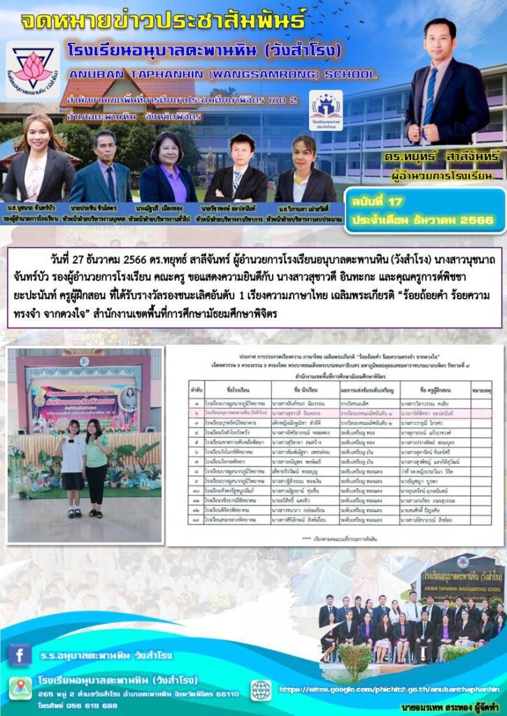 วันที่ 27 ธันวาคม 2566 ดร.ทยุทธ์ สาลีจันทร์ ผู้อำนวยการโรงเรียนอนุบาลตะพานหิน (วังสำโรง) นางสาวนุชนาถ จันทร์บัว รองผู้อำนวยการโรงเรียน คณะครู ขอแสดงความยินดีกับ นางสาวสุชาวดี อินทะกะ และคุณครูการต์พิชชา ยะปะนันท์ ครูผู้ฝึกสอน ที่ได้รับรางวัลรองชนะเลิศอันดับ 1 เรียงความภาษาไทย เฉลิมพระเกียรติ “ร้อยถ้อยคำ ร้อยความทรงจำ จากดวงใจ” สำนักงานเขตพื้นที่การศึกษามัธยมศึกษาพิจิตร