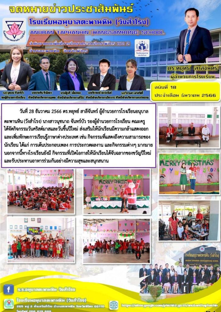 วันที่ 28 ธันวาคม 2566 ดร.ทยุทธ์ สาลีจันทร์ ผู้อำนวยการโรงเรียนอนุบาลตะพานหิน (วังสำโรง) นางสาวนุชนาถ จันทร์บัว รองผู้อำนวยการโรงเรียน คณะครู ได้จัดกิจกรรมวันคริสต์มาสและวันขึ้นปีใหม่ ส่งเสริมให้นักเรียนมีความกล้าแสดงออก และเพิ่มทักษะการเรียนรู้ภาษาต่างประเทศ เช่นกิจกรรมที่แสดงถึงความสามารถของนักเรียน ได้แก่ การเต้นประกอบเพลง การประกวดผลงาน และกิจกรรมต่างๆ มากมาย นอกจากนี้ทางโรงเรียนยังมี กิจกรรมที่เปิดโอกาสให้นักเรียนได้จับฉลากของขวัญปีใหม่ และรับประทานอาหารร่วมกันอย่างมีความสุขและสนุกสนาน