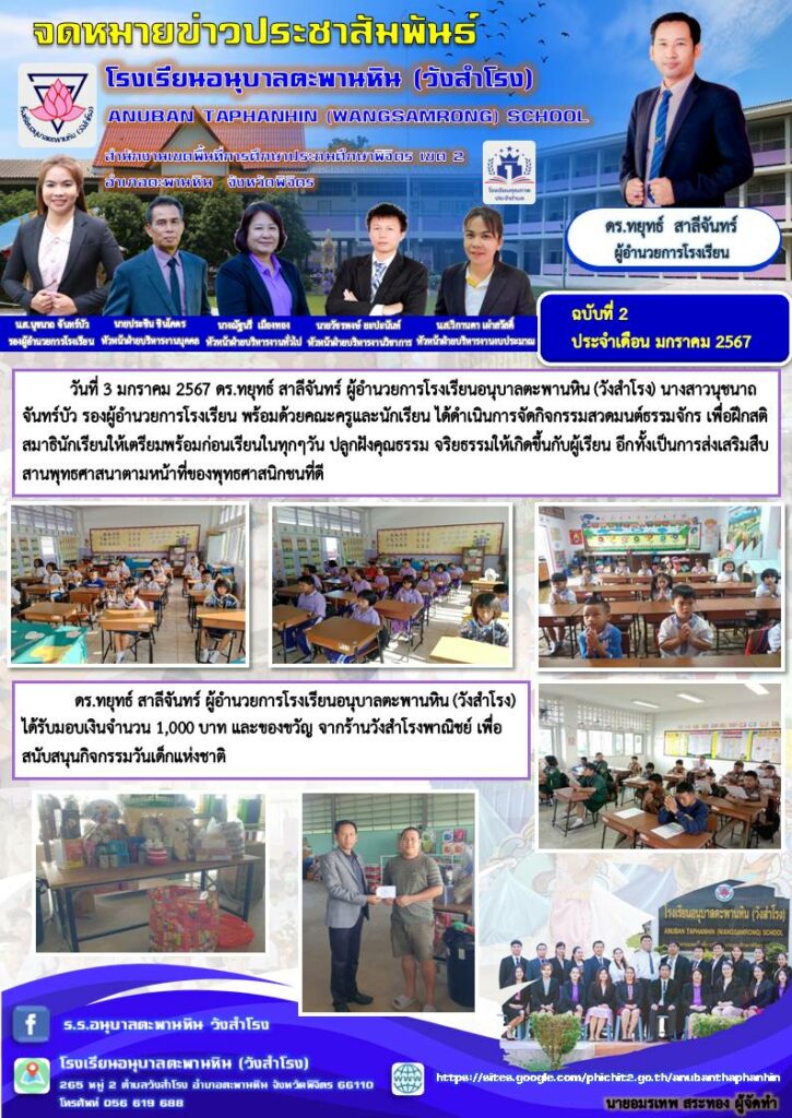 วันที่ 3 มกราคม 2567 ดร.ทยุทธ์ สาลีจันทร์ ผู้อำนวยการโรงเรียนอนุบาลตะพานหิน (วังสำโรง) นางสาวนุชนาถ จันทร์บัว รองผู้อำนวยการโรงเรียน พร้อมด้วยคณะครูและนักเรียน ได้ดำเนินการจัดกิจกรรมสวดมนต์ธรรมจักร เพื่อฝึกสติสมาธินักเรียนให้เตรียมพร้อมก่อนเรียนในทุกๆวัน ปลูกฝังคุณธรรม จริยธรรมให้เกิดขึ้นกับผู้เรียน อีกทั้งเป็นการส่งเสริมสืบสานพุทธศาสนาตามหน้าที่ของพุทธศาสนิกชนที่ดี
