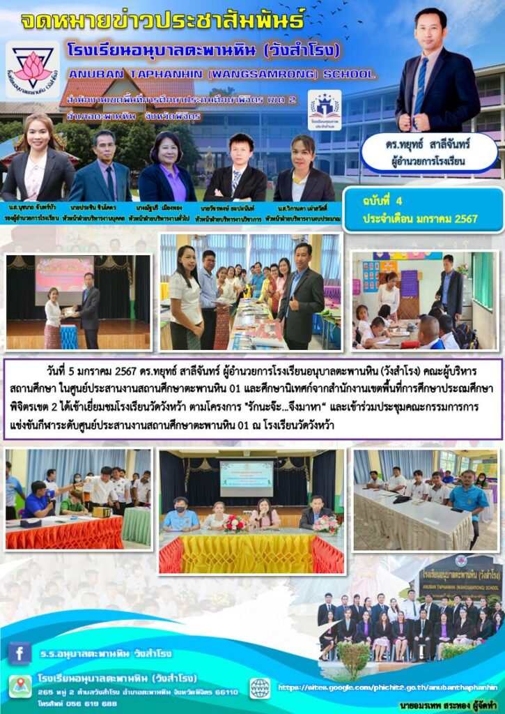 วันที่ 5 มกราคม 2567 ดร.ทยุทธ์ สาลีจันทร์ ผู้อำนวยการโรงเรียนอนุบาลตะพานหิน (วังสำโรง) คณะผู้บริหารสถานศึกษา ในศูนย์ประสานงานสถานศึกษาตะพานหิน 01 และศึกษานิเทศก์จากสำนักงานเขตพื้นที่การศึกษาประถมศึกษาพิจิตรเขต 2 ได้เข้าเยี่ยมชมโรงเรียนวัดวังหว้า ตามโครงการ “รักนะจ๊ะ…จึงมาหา“ และเข้าร่วมประชุมคณะกรรมการการแข่งขันกีฬาระดับศูนย์ประสานงานสถานศึกษาตะพานหิน 01 ณ โรงเรียนวัดวังหว้า