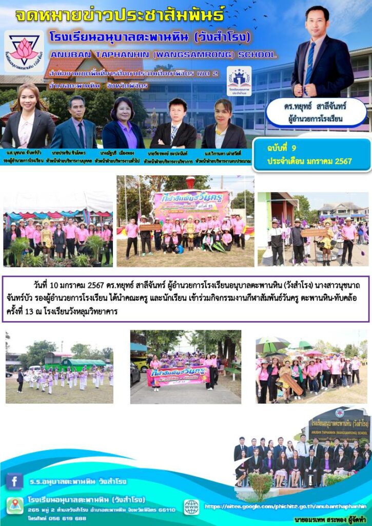วันที่ 10 มกราคม 2567 ดร.ทยุทธ์ สาลีจันทร์ ผู้อำนวยการโรงเรียนอนุบาลตะพานหิน (วังสำโรง) นางสาวนุชนาถ จันทร์บัว รองผู้อำนวยการโรงเรียน ได้นำคณะครู และนักเรียน เข้าร่วมกิจกรรมงานกีฬาสัมพันธ์วันครู ตะพานหิน-ทับคล้อ ครั้งที่ 13 ณ โรงเรียนวังหลุมวิทยาคาร