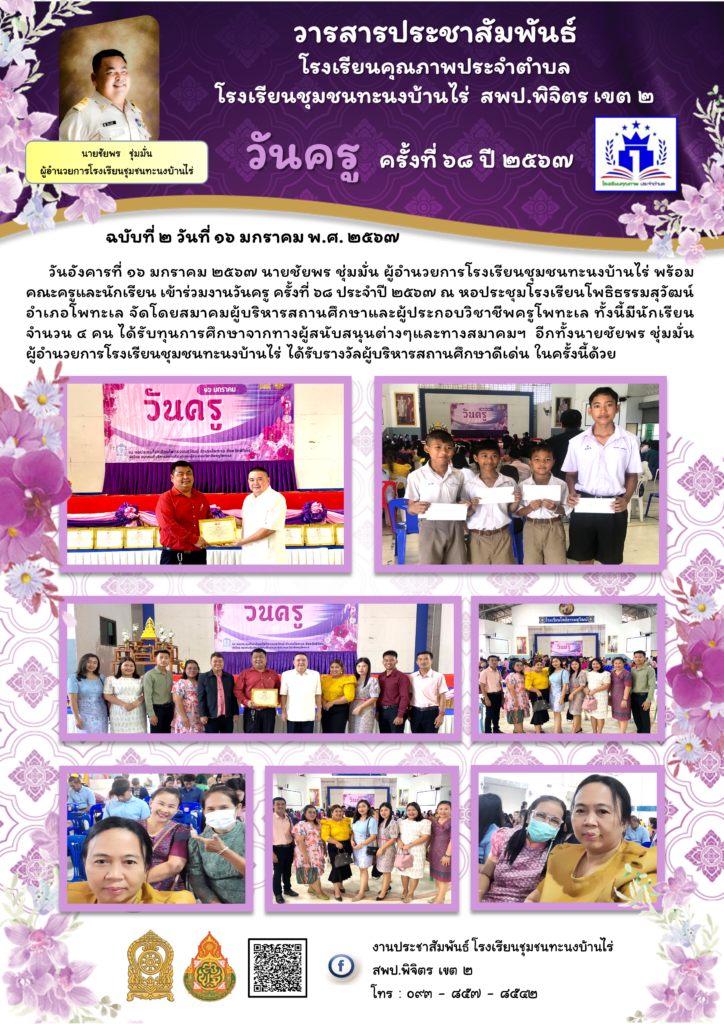 วันอังคารที่ ๑๖ มกราคม ๒๕๖๗ นายชัยพร ชุ่มมั่น ผู้อำนวยการโรงเรียนชุมชนทะนงบ้านไร่ พร้อมคณะครูและนักเรียน เข้าร่วมงานวันครู ครั้งที่ ๖๘ ประจำปี ๒๕๖๗ ณ หอประชุมโรงเรียนโพธิธรรมสุวัฒน์ อำเภอโพทะเล จัดโดยสมาคมผู้บริหารสถานศึกษาและผู้ประกอบวิชาชีพครูโพทะเล ทั้งนี้มีนักเรียนจำนวน ๔ คน ได้รับทุนการศึกษาจากทางผู้สนับสนุนต่างๆและทางสมาคมฯ อีกทั้งนายชัยพร ชุ่มมั่น ผู้อำนวยการโรงเรียนชุมชนทะนงบ้านไร่ ได้รับรางวัลผู้บริหารสถานศึกษาดีเด่น ในครั้งนี้ด้วย
