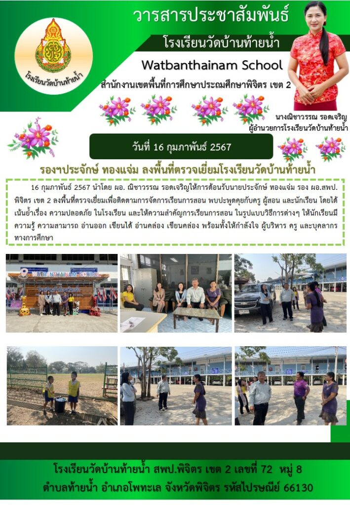 16กุมภาพันธ์ 2567 นำโดย ผอ. ณิชาวรรณ รอดเจริญให้การต้อนรับนายประจักษ์ ทองแจ่ม รอง ผอ.สพป.พิจิตร เขต 2 ลงพื้นที่ตรวจเยี่ยมเพื่อติดตามการจัดการเรียนการสอน พบปะพูดคุยกับครู ผู้สอน และนักเรียน โดยได้เน้นย้ำเรื่อง ความปลอดภัย ในโรงเรียน และให้ความสำคัญการเรียนการสอน ในรูปแบบวิธีการต่างๆ ให้นักเรียนมีความรู้ ความสามารถ อ่านออก เขียนได้ อ่านคล่อง เขียนคล่อง พร้อมทั้งให้กำลังใจ ผู้บริหาร ครู และบุคลากรทางการศึกษา