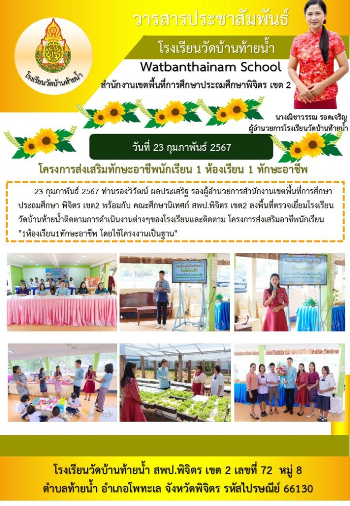 23 กุมภาพันธ์ 2567 ท่านรองวิวัฒน์ ผลประเสริฐ รองผู้อำนวยการสำนักงานเขตพื้นที่การศึกษาประถมศึกษา พิจิตร เขต2 พร้อมกับ คณะศึกษานิเทศก์ สพป.พิจิตร เขต2 ลงพื้นที่ตรวจเยี่ยมโรงเรียนวัดบ้านท้ายน้ำติดตามการดำเนินงานต่างๆของโรงเรียนและติดตาม โครงการส่งเสริมอาชีพนักเรียน “1ห้องเรียน1ทักษะอาชีพ โดยใช้โครงงานเป็นฐาน”