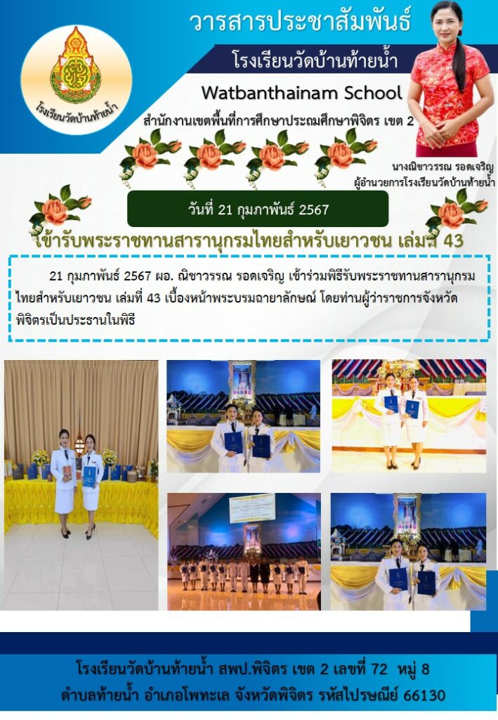 21 กุมภาพันธ์ 2567 ผอ. ณิชาวรรณ รอดเจริญ เข้าร่วมพิธีรับพระราชทานสารานุกรมไทยสำหรับเยาวชน เล่มที่ 43 เบื้องหน้าพระบรมฉายาลักษณ์ โดยท่านผู้ว่าราชการจังหวัดพิจิตรเป็นประธานในพิธี