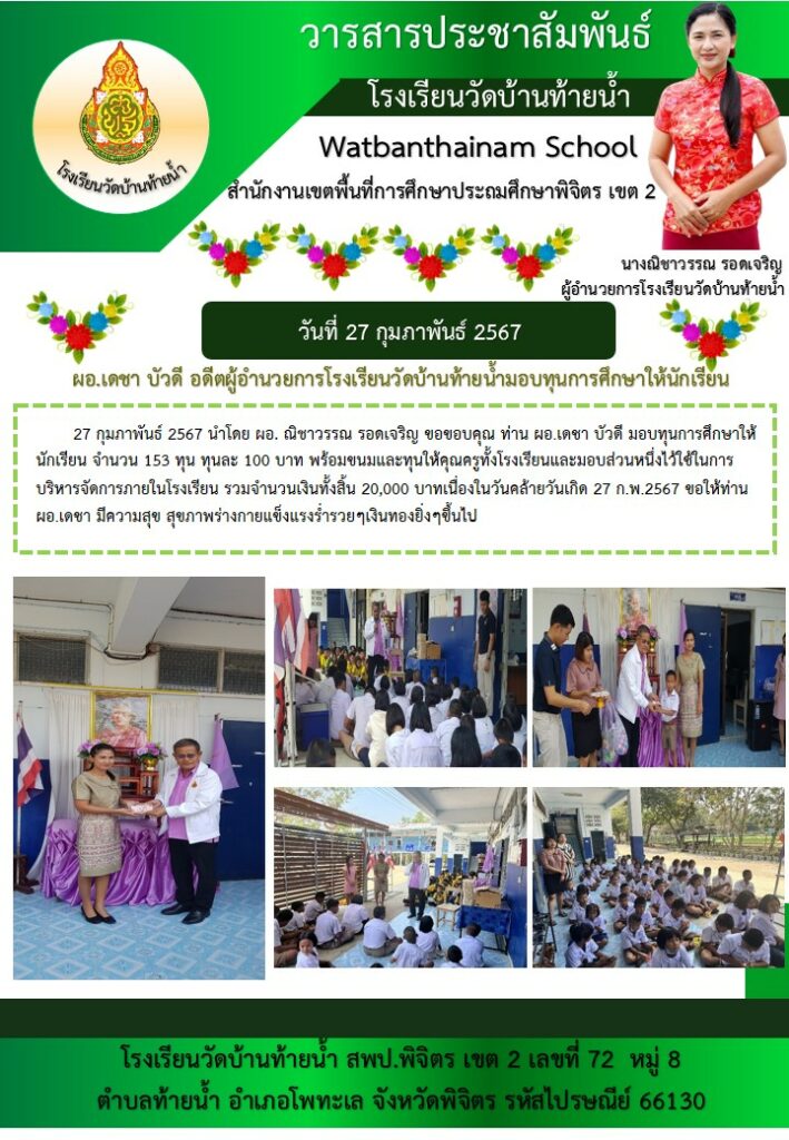 27 กุมภาพันธ์ 2567 นำโดย ผอ. ณิชาวรรณ รอดเจริญ ขอขอบคุณ ท่าน ผอ.เดชา บัวดี มอบทุนการศึกษาให้นักเรียน จำนวน 153 ทุน ทุนละ 100 บาท พร้อมขนมและทุนให้คุณครูทั้งโรงเรียนและมอบส่วนหนึ่งไว้ใช้ในการบริหารจัดการภายในโรงเรียน รวมจำนวนเงินทั้งสิ้น 20,000 บาทเนื่องในวันคล้ายวันเกิด 27 ก.พ.2567 ขอให้ท่าน ผอ.เดชา มีความสุข สุขภาพร่างกายแข็งแรงร่ำรวยๆเงินทองยิ่งๆขึ้นไป