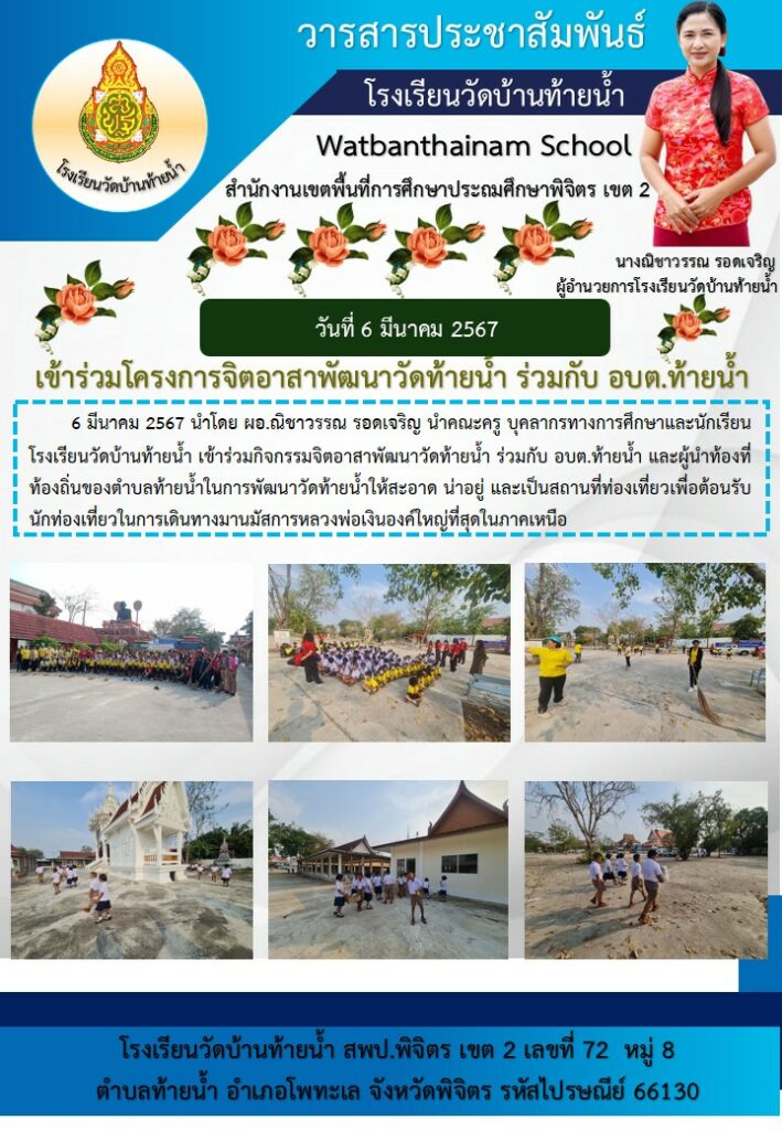6 มีนาคม 2567 นำโดย ผอ.ณิชาวรรณ รอดเจริญ นำคณะครู บุคลากรทางการศึกษาและนักเรียนโรงเรียนวัดบ้านท้ายน้ำ เข้าร่วมกิจกรรมจิตอาสาพัฒนาวัดท้ายน้ำ ร่วมกับ อบต.ท้ายน้ำ และผู้นำท้องที่ท้องถิ่นของตำบลท้ายน้ำในการพัฒนาวัดท้ายน้ำให้สะอาด น่าอยู่ และเป็นสถานที่ท่องเที่ยวเพื่อต้อนรับนักท่องเที่ยวในการเดินทางมานมัสการหลวงพ่อเงินองค์ใหญ่ที่สุดในภาคเหนือ