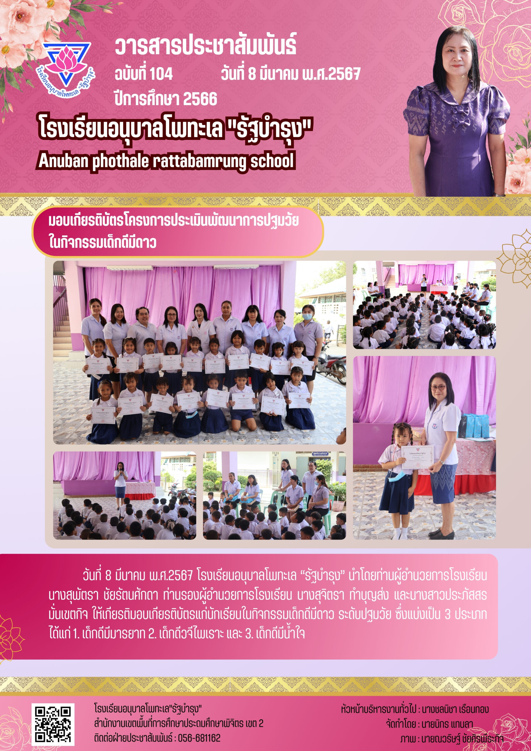มอบเกียรติบัตรโครงการประเมินพัฒนาการปฐมวัย ในกิจกรรมเด็กดีมีดาว