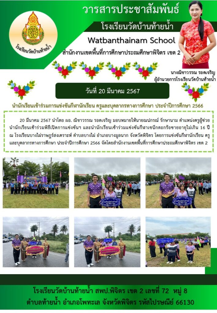 20 มีนาคม 2567 นำโดย ผอ. ณิชาวรรณ รอดเจริญ มอบหมายให้นายณปกรณ์ รักษานาม ตำแหน่งครูผู้ช่วยนำนักเรียนเข้าร่วมพิธีเปิดการแข่งขันฯ และนำนักเรียนเข้าร่วมแข่งขันกีฬาเซปักตะกร้อชายอายุไม่เกิน 16 ปี ณ โรงเรียนบางไผ่ราษฎร์สงเคราะห์ ตำบลบางไผ่ อำเภอบางมูลนาก จังหวัดพิจิตร โดยการแข่งขันกีฬานักเรียน ครู และบุคลากรทางการศึกษา ประจำปีการศึกษา 2566 จัดโดยสำนักงานเขตพื้นที่การศึกษาประถมศึกษาพิจิตร เขต 2