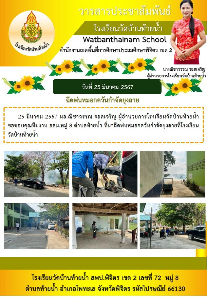 25 มีนาคม 2567 ผอ.ณิชาวรรณ รอดเจริญ ผู้อำนวยการโรงเรียนวัดบ้านท้ายน้ำ ขอขอบคุณทีมงาน อสม.หมู่ 8 ตำบลท้ายน้ำ ที่มาฉีดพ่นหมอกควันกำจัดยุงลายที่โรงเรียน วัดบ้านท้ายน้ำ