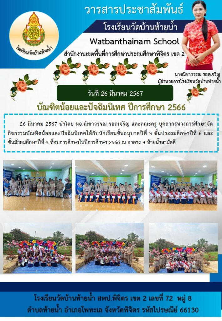 26 มีนาคม 2567 นำโดย ผอ.ณิชาวรรณ รอดเจริญ และคณะครู บุคลากรทางการศึกษาจัดกิจกรรมบัณฑิตน้อยและปัจฉิมนิเทศให้กับนักเรียนชั้นอนุบาลปีที่ 3 ชั้นประถมศึกษาปีที่ 6 และชั้นมัธยมศึกษาปีที่ 3 ที่จบการศึกษาในปีการศึกษา 2566 ณ อาคาร 3 ท้ายน้ำสามัคคี