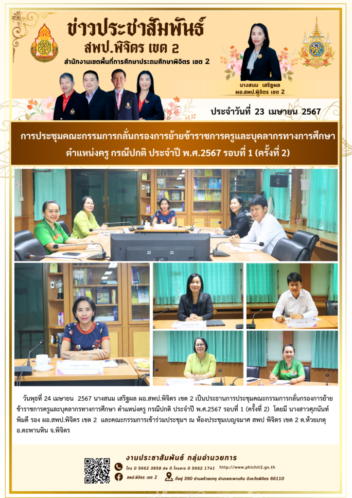 การประชุมคณะกรรมการกลั่นกรองการย้ายข้าราชการครูและบุคลากรทางการศึกษา ตำแหน่งครู กรณีปกติ ประจำปี พ.ศ.2567 รอบที่ 1 (ครั้งที่ 2)