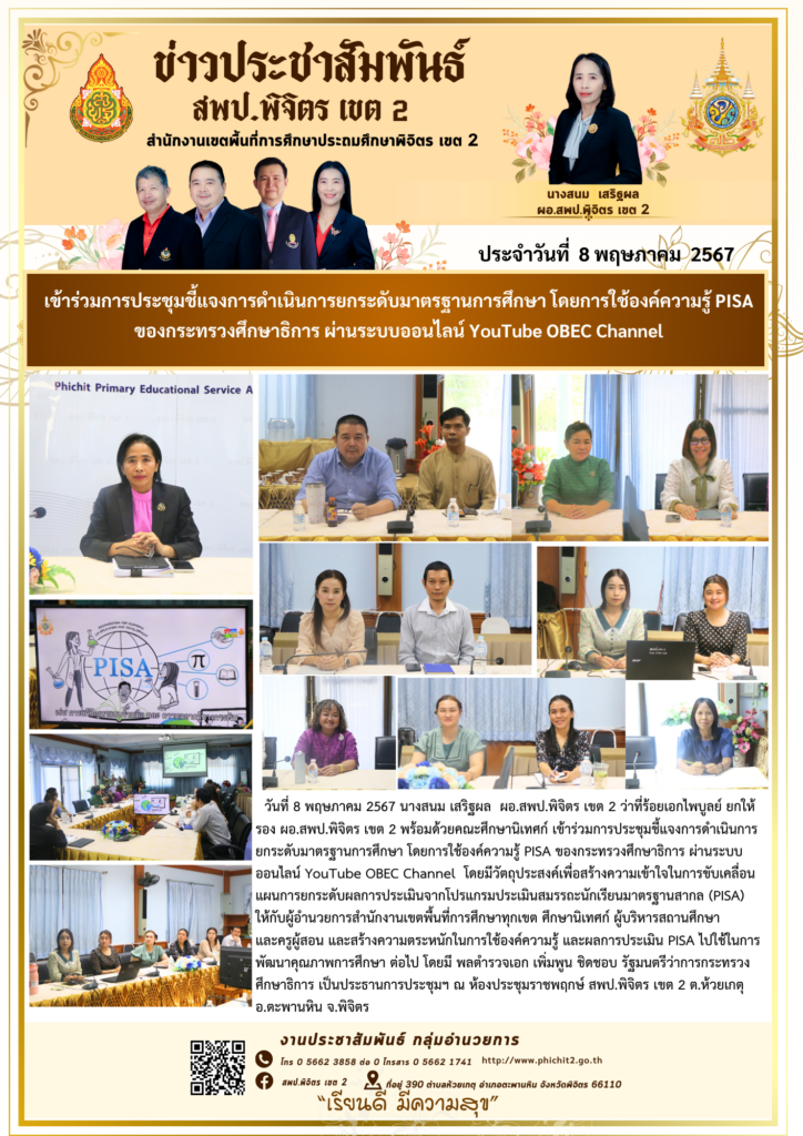 เข้าร่วมการประชุมชี้แจงการดำเนินการยกระดับมาตรฐานการศึกษา โดยการใช้องค์ความรู้ PISA ของกระทรวงศึกษาธิการ ผ่านระบบออนไลน์ YouTube OBEC Channel