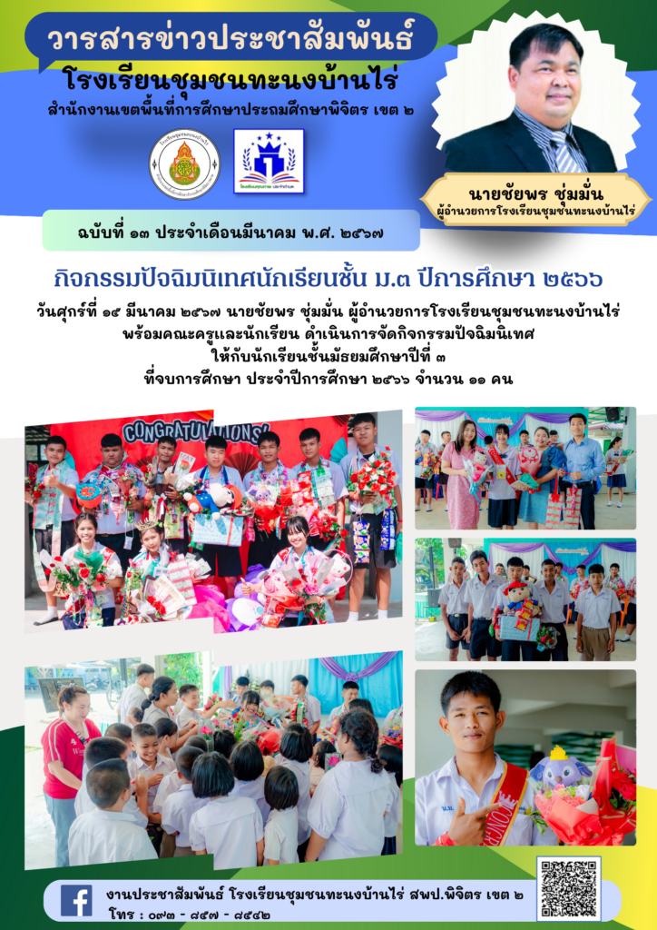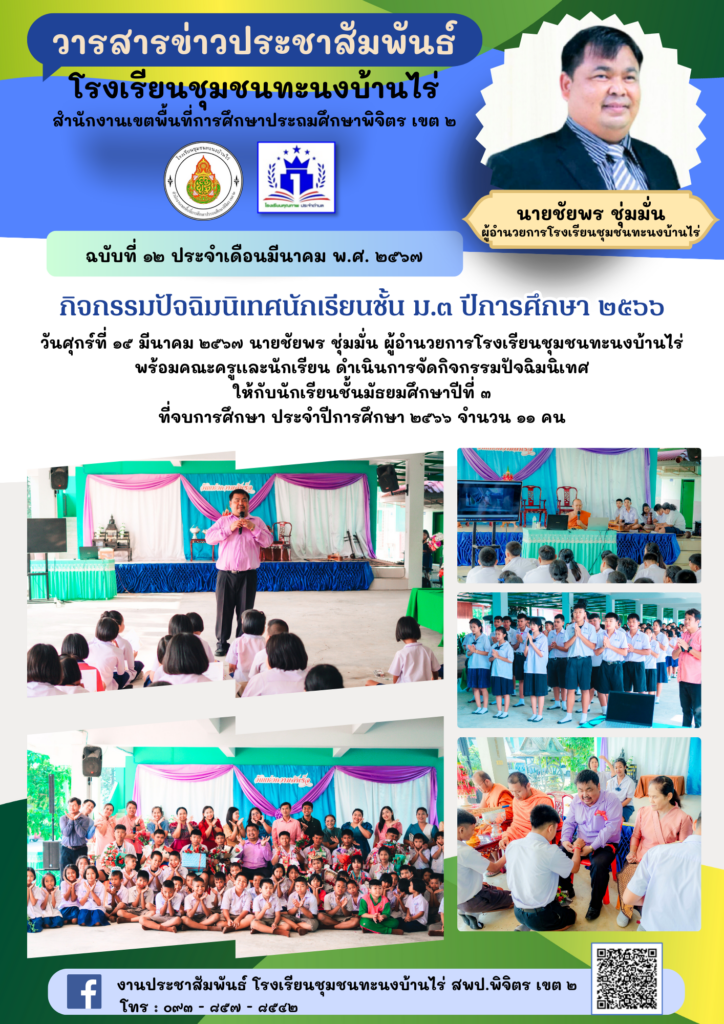 วันศุกร์ที่ ๑๕ มีนาคม ๒๕๖๗ นายชัยพร ชุ่มมั่น ผู้อำนวยการโรงเรียนชุมชนทะนงบ้านไร่ พร้อมคณะครูเเละนักเรียน ดำเนินการจัดกิจกรรมปัจฉิมนิเทศ ให้กับนักเรียนชั้นมัธยมศึกษาปีที่ ๓ ที่จบการศึกษา ประจำปีการศึกษา ๒๕๖๖ จำนวน ๑๑ คน