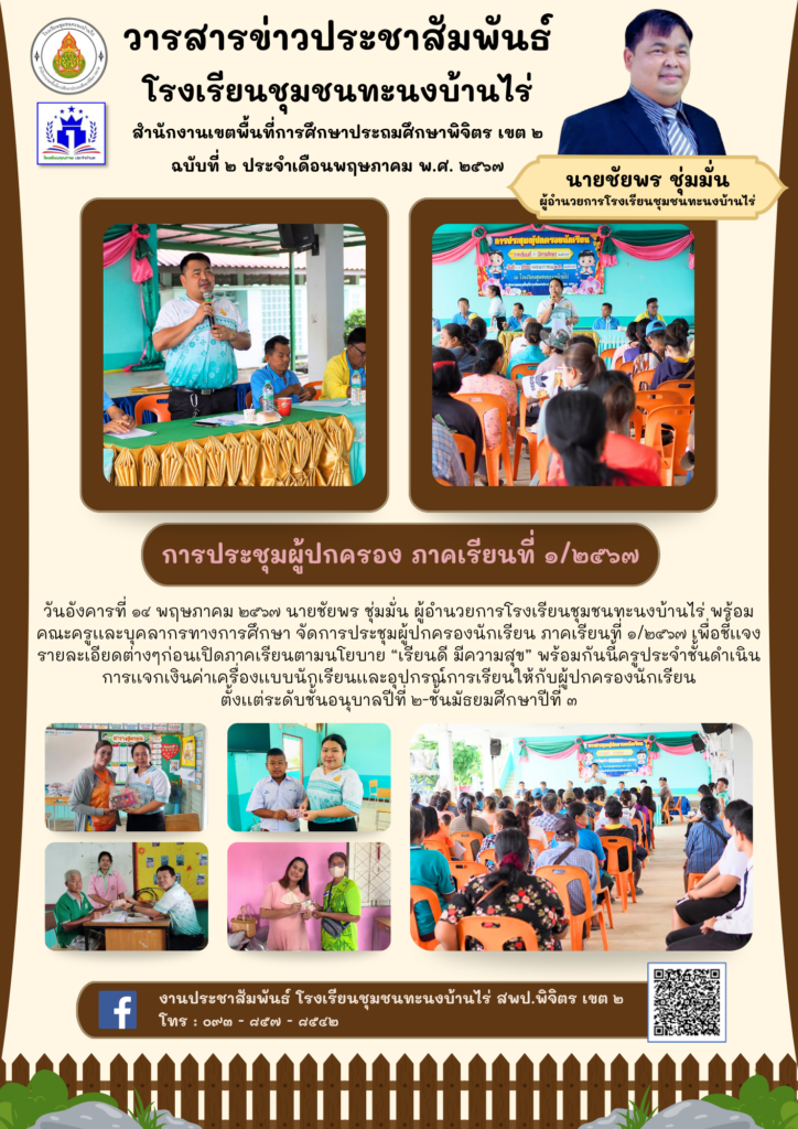วันอังคารที่ ๑๔ พฤษภาคม ๒๕๖๗ นายชัยพร ชุ่มมั่น ผู้อำนวยการโรงเรียนชุมชนทะนงบ้านไร่ พร้อมคณะครูเเละบุคลากรทางการศึกษา จัดการประชุมผู้ปกครองนักเรียน ภาคเรียนที่ ๑/๒๕๖๗ เพื่อชี้เเจงรายละเอียดต่างๆก่อนเปิดภาคเรียนตามนโยบาย “เรียนดี มีความสุข” พร้อมกันนี้ครูประจำชั้นดำเนินการเเจกเงินค่าเครื่องเเบบนักเรียนเเละอุปกรณ์การเรียนให้กับผู้ปกครองนักเรียน ตั้งเเต่ระดับชั้นอนุบาลปีที่ ๒-ชั้นมัธยมศึกษาปีที่ ๓