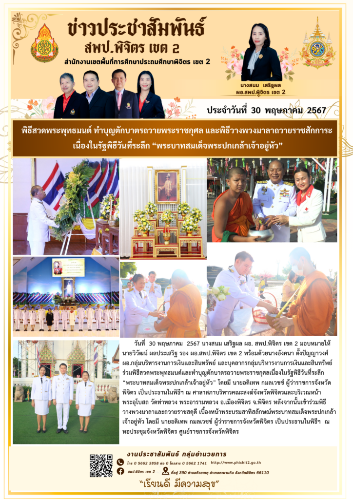 พิธีสวดพระพุทธมนต์ ทำบุญตักบาตรถวายพระราชกุศล และพิธีวางพวงมาลาถวายราชสักการะ เนื่องในรัฐพิธีวันที่ระลึก “พระบาทสมเด็จพระปกเกล้าเจ้าอยู่หัว”
