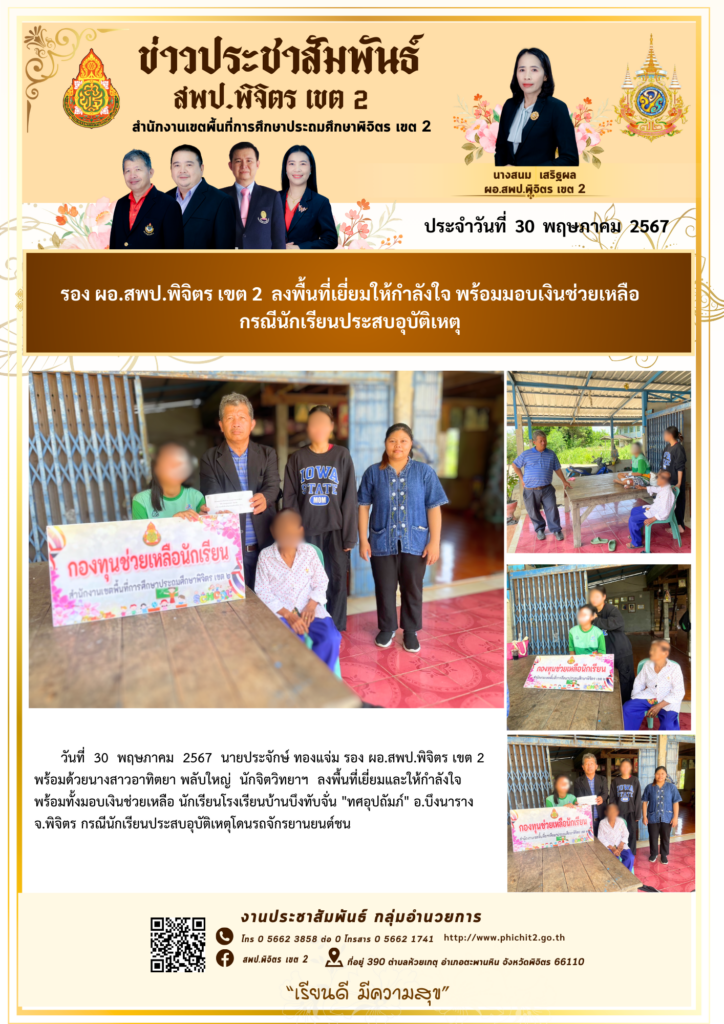 รอง ผอ.สพป.พิจิตร เขต 2 ลงพื้นที่เยี่ยมให้กำลังใจ พร้อมมอบเงินช่วยเหลือ กรณีนักเรียนประสบอุบัติเหตุ