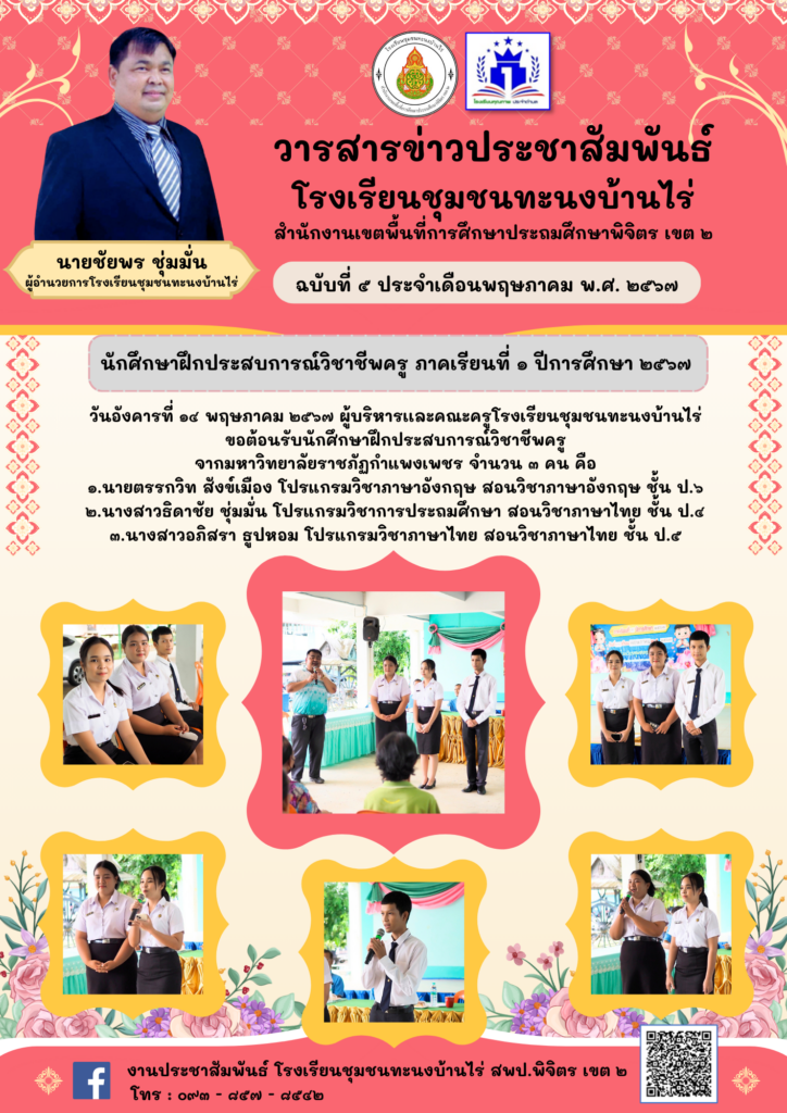 วันอังคารที่ ๑๔ พฤษภาคม ๒๕๖๗ ผู้บริหารเเละคณะครูโรงเรียนชุมชนทะนงบ้านไร่ ขอต้อนรับนักศึกษาฝึกประสบการณ์วิชาชีพครู