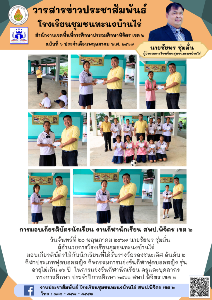 วันจันทร์ที่ ๒๐ พฤษภาคม ๒๕๖๗ นายชัยพร ชุ่มมั่น ผู้อำนวยการโรงเรียนชุมชนทะนงบ้านไร่ มอบเกียรติบัตรให้กับนักเรียนที่ได้รับรางวัลรองชนะเลิศ อันดับ ๒ กีฬาประเภทฟุตบอลหญิง กิจกรรมการเเข่งขันกีฬาฟุตบอลหญิง รุ่นอายุไม่เกิน ๑๖ ปี ในการเเข่งขันกีฬานักเรียน ครูเเละบุคลากรทางการศึกษา ประจำปีการศึกษา ๒๕๖๖ สพป.พิจิตร เขต ๒