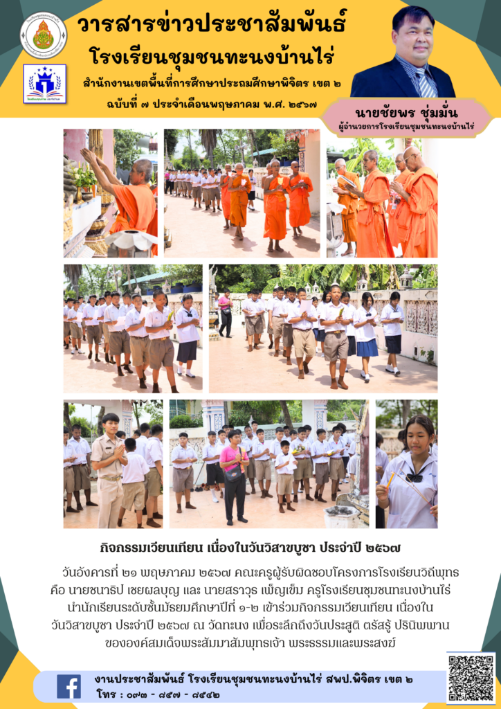 วันอังคารที่ ๒๑ พฤษภาคม ๒๕๖๗ คณะครูผู้รับผิดชอบโครงการโรงเรียนวิถีพุทธ คือ นายชนาธิป เชยผลบุญ เเละ นายสราวุธ เพ็ญเข็ม ครูโรงเรียนชุมชนทะนงบ้านไร่ นำนักเรียนระดับชั้นมัธยมศึกษาปีที่ ๑-๒ เข้าร่วมกิจกรรมเวียนเทียน เนื่องใน วันวิสาขบูชา ประจำปี ๒๕๖๗ ณ วัดทะนง เพื่อระลึกถึงวันประสูติ ตรัสรู้ ปรินิพพาน ขององค์สมเด็จพระสัมมาสัมพุทธเจ้า พระธรรมและพระสงฆ์