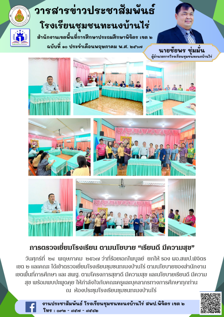 วันศุกร์ที่ ๒๔ พฤษภาคม ๒๕๖๗ ว่าที่ร้อยเอกไพบูลย์ ยกให้ รอง ผอ.สพป.พิจิตร เขต ๒ และคณะ ได้เข้าตรวจเยี่ยมโรงเรียนชุมชนทะนงบ้านไร่ ตามนโยบายของสำนักงานเขตพื้นที่การศึกษา และ สพฐ. ตามโครงการสุขาดี มีความสุข และนโยบายเรียนดี มีความสุข พร้อมพบปะพูดคุย ให้กำลังใจกับคณะครูและบุคลากรทางการศึกษาทุกท่าน ณ ห้องประชุมโรงเรียนชุมชนทะนงบ้านไร่