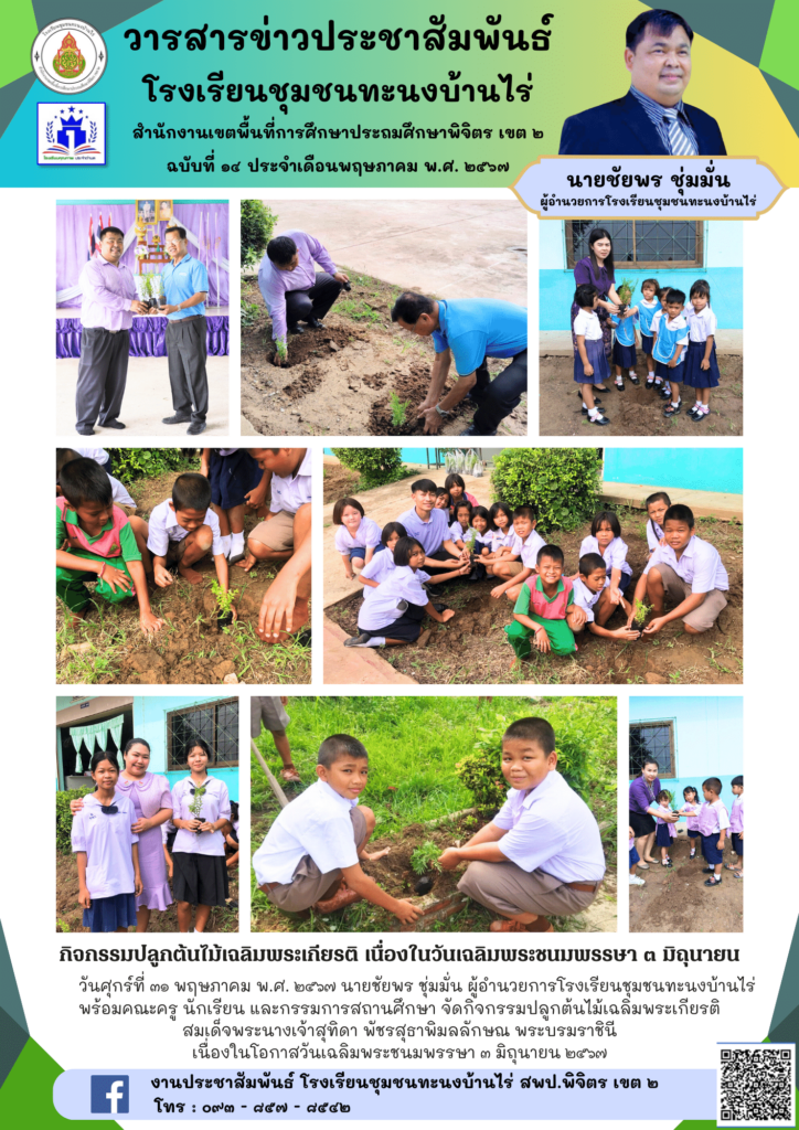 วันศุกร์ที่ ๓๑ พฤษภาคม พ.ศ. ๒๕๖๗ นายชัยพร ชุ่มมั่น ผู้อำนวยการโรงเรียนชุมชนทะนงบ้านไร่ พร้อมคณะครู นักเรียน และกรรมการสถานศึกษา จัดกิจกรรมปลูกต้นไม้เฉลิมพระเกียรติ สมเด็จพระนางเจ้าสุทิดา พัชรสุธาพิมลลักษณ พระบรมราชินี เนื่องในโอกาสวันเฉลิมพระชนมพรรษา ๓ มิถุนายน ๒๕๖๗