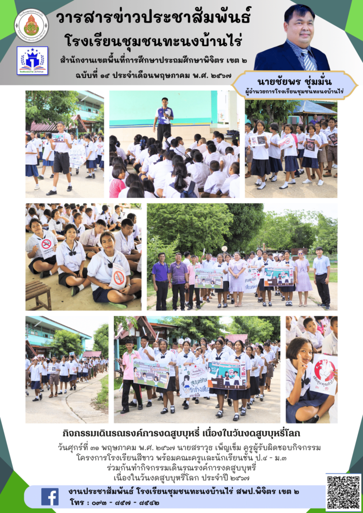วันศุกร์ที่ ๓๑ พฤษภาคม พ.ศ. ๒๕๖๗ นายสราวุธ เพ็ญเข็ม ครูผู้รับผิดชอบกิจกรรมโครงการโรงเรียนสีขาว พร้อมคณะครูเเละนักเรียนชั้น ป.๔ – ม.๓ ร่วมกันทำกิจกรรมเดินรณรงค์การงดสูบบุหรี่ เนื่องในวันงดสูบบุหรี่โลก ประจำปี ๒๕๖๗