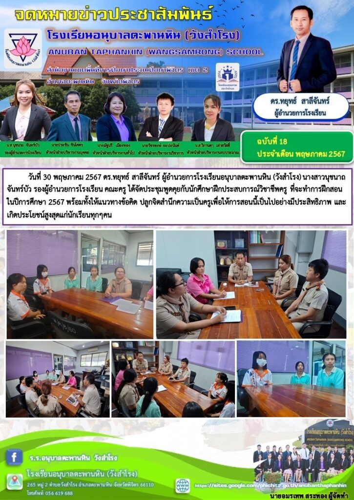 วันที่ 30 พฤษภาคม 2567 ดร.ทยุทธ์ สาลีจันทร์ ผู้อำนวยการโรงเรียนอนุบาลตะพานหิน (วังสำโรง) นางสาวนุชนาถ จันทร์บัว รองผู้อำนวยการโรงเรียน คณะครู ได้จัดประชุมพูดคุยกับนักศึกษาฝึกประสบการณ์วิชาชีพครู ที่จะทำการฝึกสอนในปีการศึกษา 2567 พร้อมทั้งให้แนวทางข้อคิด ปลูกจิตสำนึกความเป็นครูเพื่อให้การสอนนี้เป็นไปอย่างมีประสิทธิภาพ และเกิดประโยชน์สูงสุดแก่นักเรียนทุกๆคน