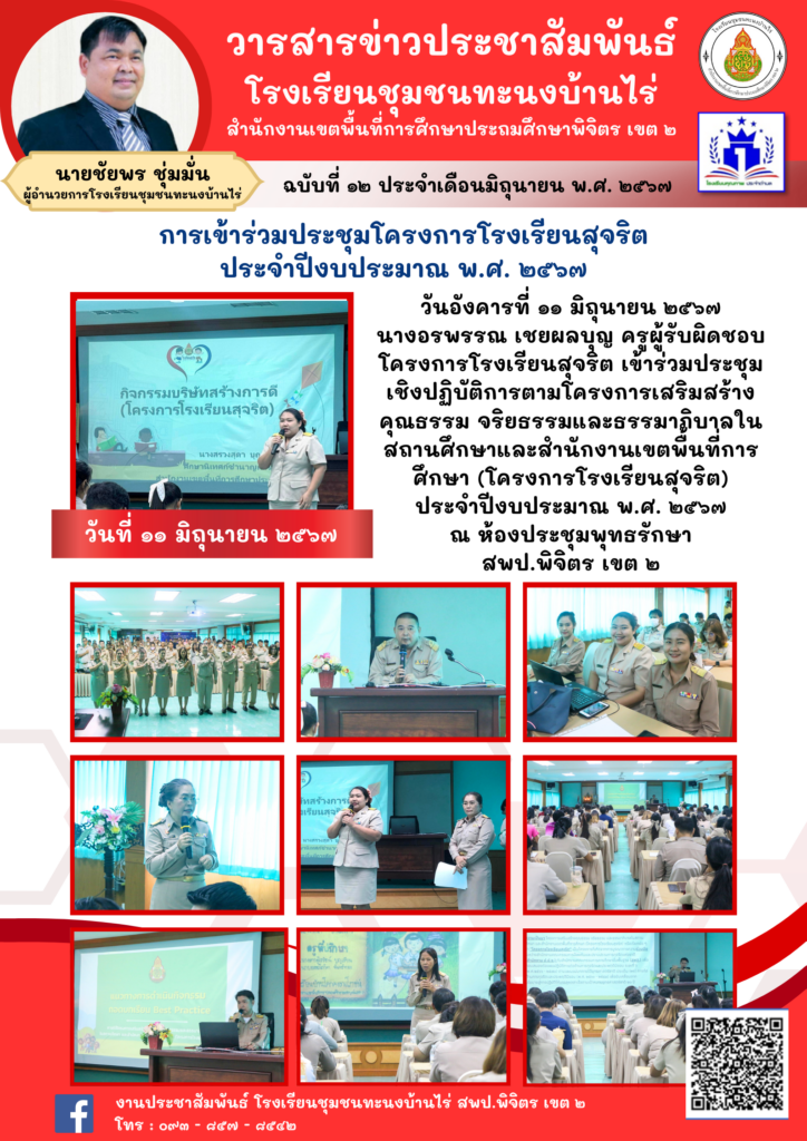 วันอังคารที่ ๑๑ มิถุนายน ๒๕๖๗ นางอรพรรณ เชยผลบุญ ครูผู้รับผิดชอบโครงการโรงเรียนสุจริต เข้าร่วมประชุมเชิงปฏิบัติการตามโครงการเสริมสร้างคุณธรรม จริยธรรมและธรรมาภิบาลในสถานศึกษาและสำนักงานเขตพื้นที่การศึกษา (โครงการโรงเรียนสุจริต) ประจำปีงบประมาณ พ.ศ. ๒๕๖๗ ณ ห้องประชุมพุทธรักษา สพป.พิจิตร เขต ๒