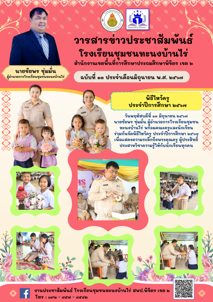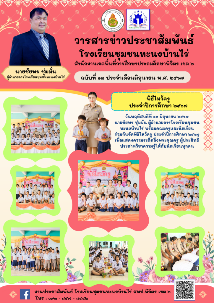 วันพฤหัสบดีที่ ๑๓ มิถุนายน ๒๕๖๗ นายชัยพร ชุ่มมั่น ผู้อำนวยการโรงเรียนชุมชนทะนงบ้านไร่ พร้อมคณะครูเเละนักเรียน ร่วมกันจัดพิธีไหว้ครู ประจำปีการศึกษา ๒๕๖๗ เพื่อแสดงความระลึกถึงพระคุณครู ผู้ประสิทธิ์ประสาทวิชาความรู้ให้กับนักเรียนทุกคน