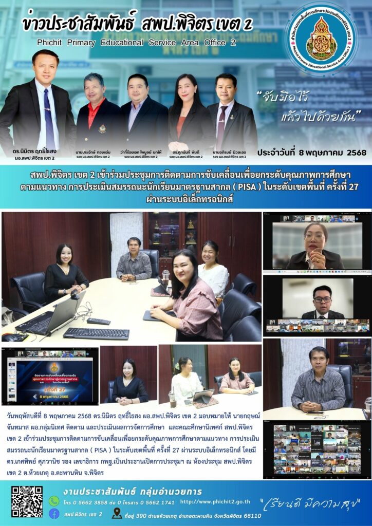 สพป.พิจิตร เขต 2 เข้าร่วมประชุมการติดตามการขับเคลื่อนเพื่อยกระดับคุณภาพการศึกษา ตามแนวทาง การประเมินสมรรถนะนักเรียนมาตรฐานสากล ( PISA ) ในระดับเขตพื้นที่ ครั้งที่ 27 ผ่านระบบอิเล็กทรอนิกส์